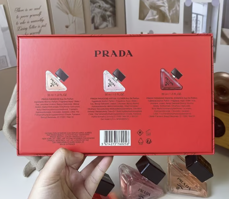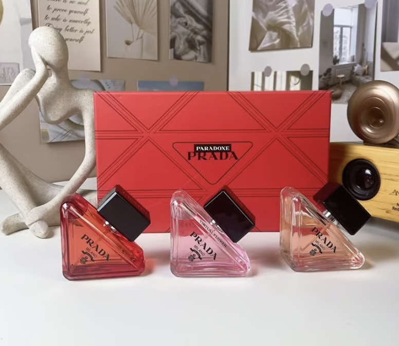 Displayed against a crisp white background, this Prada Paradoxe miniature set highlights the brand’s iconic modern design. Three signature triangular glass bottles, filled with delicately tinted fragrances, are arranged in front of a bold red Prada Paradoxe gift box featuring refined geometric detailing. Finished with sleek black caps and precise branding, the bottles are clearly showcased for a polished, premium presentation. Perfect for gifting or display, this set combines contemporary style with timeless luxury.